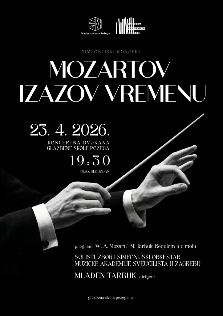 Glazbena škola Požega poziva vas na Simfonijski koncert koji će se održati 23. travnja 2026. godine u Koncertnoj dvorani Glazbene škole Požega s početkom u 19:30 sati.
